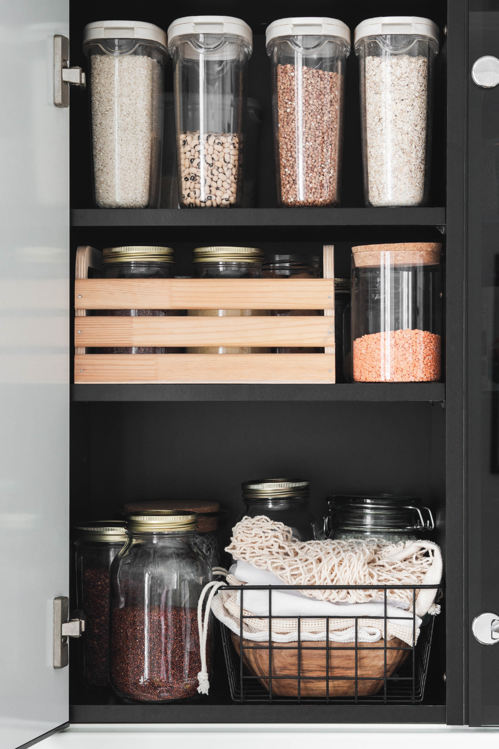 For smaller items like spices, small packets, and condiments, use tiered organizers or drawer inserts to prevent them from getting lost in the back of the pantry.